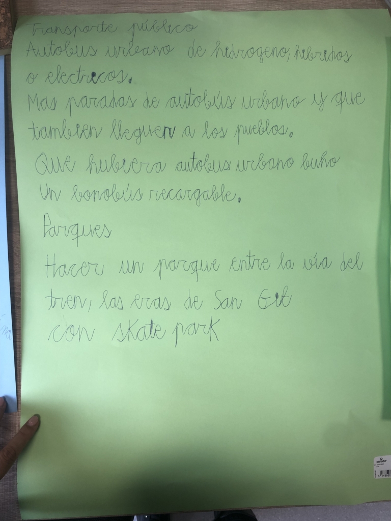 Transition: being specific, they demand a better public transport system with: hydrogen fuel cell buses, electric or hybrid buses, more bus tops (including in small towns nearby, and in their neighborhood “Las Tenerías”), urban night buses, and rechargeable bus passes. More small shops, and more parks, one in particular between the railway line and San Gil’s old threshing floors with a skate park.