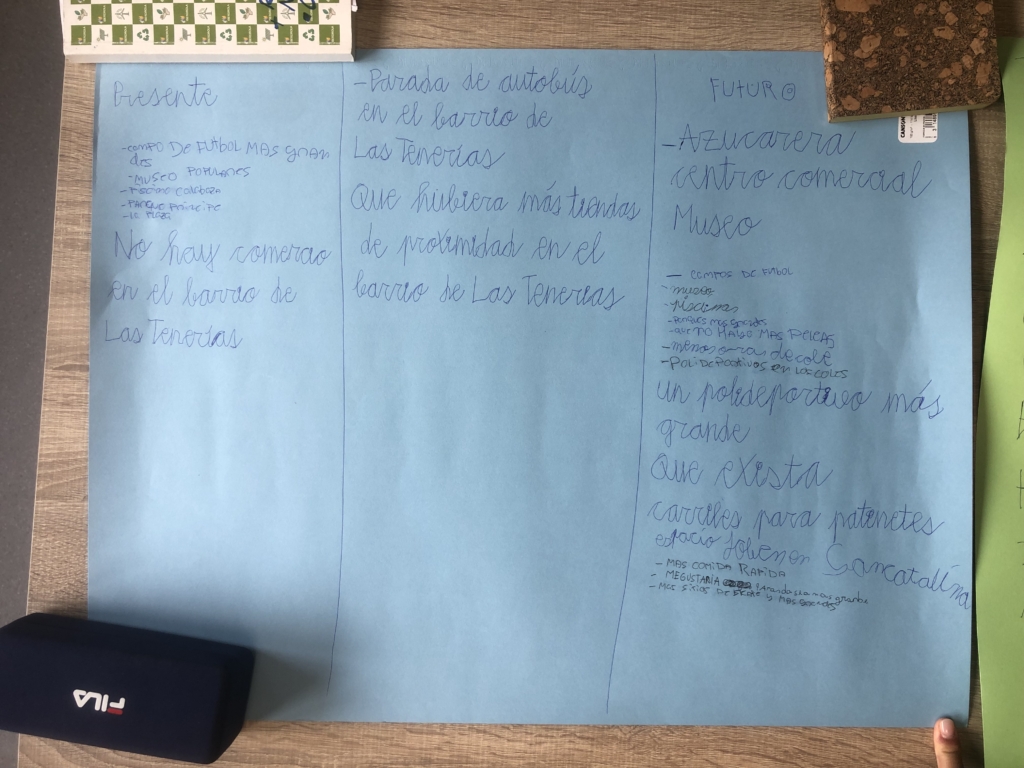 Future: they would like the former sugar factory (“Azucarera”) to become a shopping mall and/or a museum. They want more soccer fields, museums, swimming pools, sport centers, bigger parks, and skateboard lanes and skate parks (more and bigger). Interestingly, they mention “less fights” indicating that there are perhaps a few in their neighborhood. Also, they’d like to spend less time in school, and have their own space for young people quite like this one. Unfortunately, they also mention more fast-food places. And in general they’d like to see their city grow.