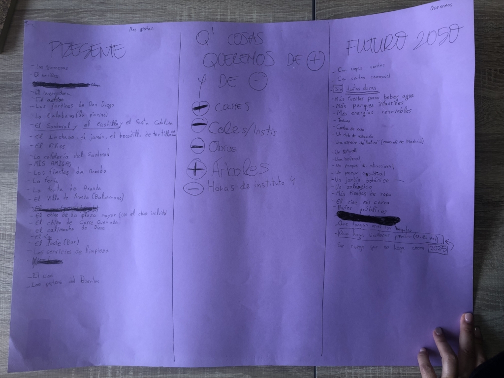 Future: they want to see a future with more green areas (including a botanic garden, a zoo, and a large park like “El Retiro” in Madrid), shopping malls, with less construction work, more fountains to drink, more kids-friendly parks, more renewable energy, zip lines, leisure centers, a swimming club, a photocall, a bowling alley, a theme park, a water park, more clothing stores, a closer movie theater (the current one is in the outskirts of the city, very far away from the center), public restrooms, a nightclub for kids from 12 to 15 (this is needed now in 2025!) And also, they want to see ducklings!
