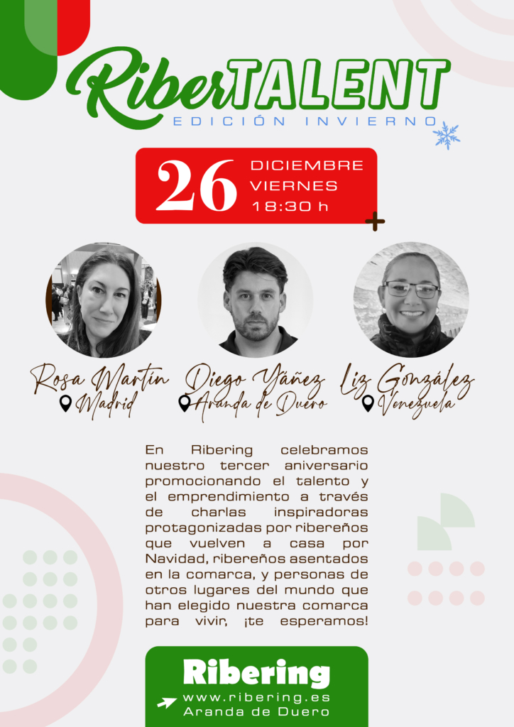 Y así lo vamos a celebrar: repasando el camino recorrido y avistando el horizonte por recorrer. Todo ello aderezado con un cóctel navideño y sobre todo charlas inspiradoras de gente talentosa y emprendedora: personas de la Ribera que vuelven a casa por Navidad, personas originarias de otros lugares del mundo que han decidido instalarse aquí por nuestra calidad de vida, por las oportunidades profesionales, por nuestra esencia o por nuestro patrimonio cultural y natural. Y, por supuesto, talento oriundo arandino que sigue creyendo en Aranda y la Ribera como una forma de vida. Dentro de todo este cóctel, contaremos con tres testimonios que nos compartirán sus experiencias, ideas o proyectos, haciéndonos partícipes de sus sueños: