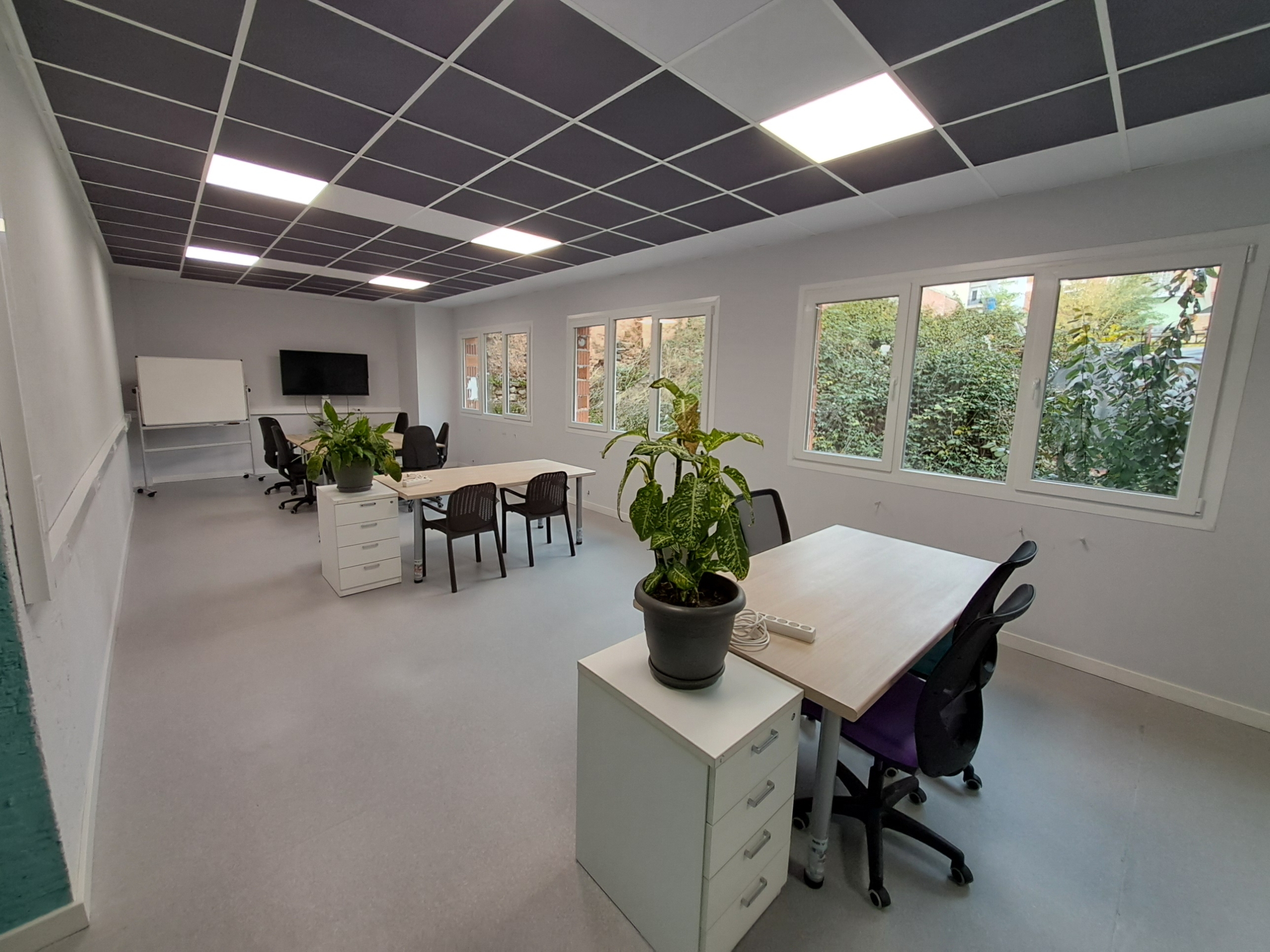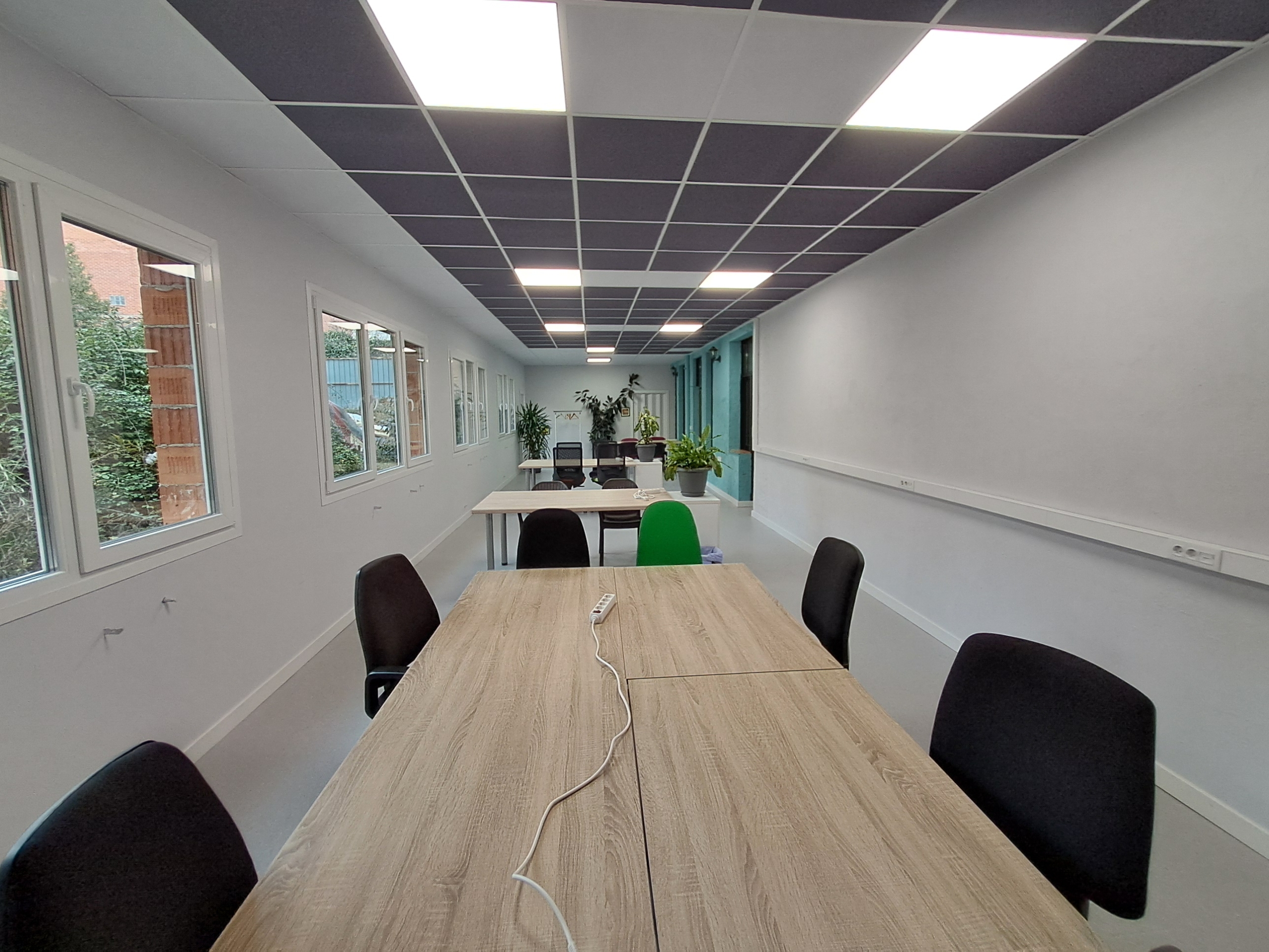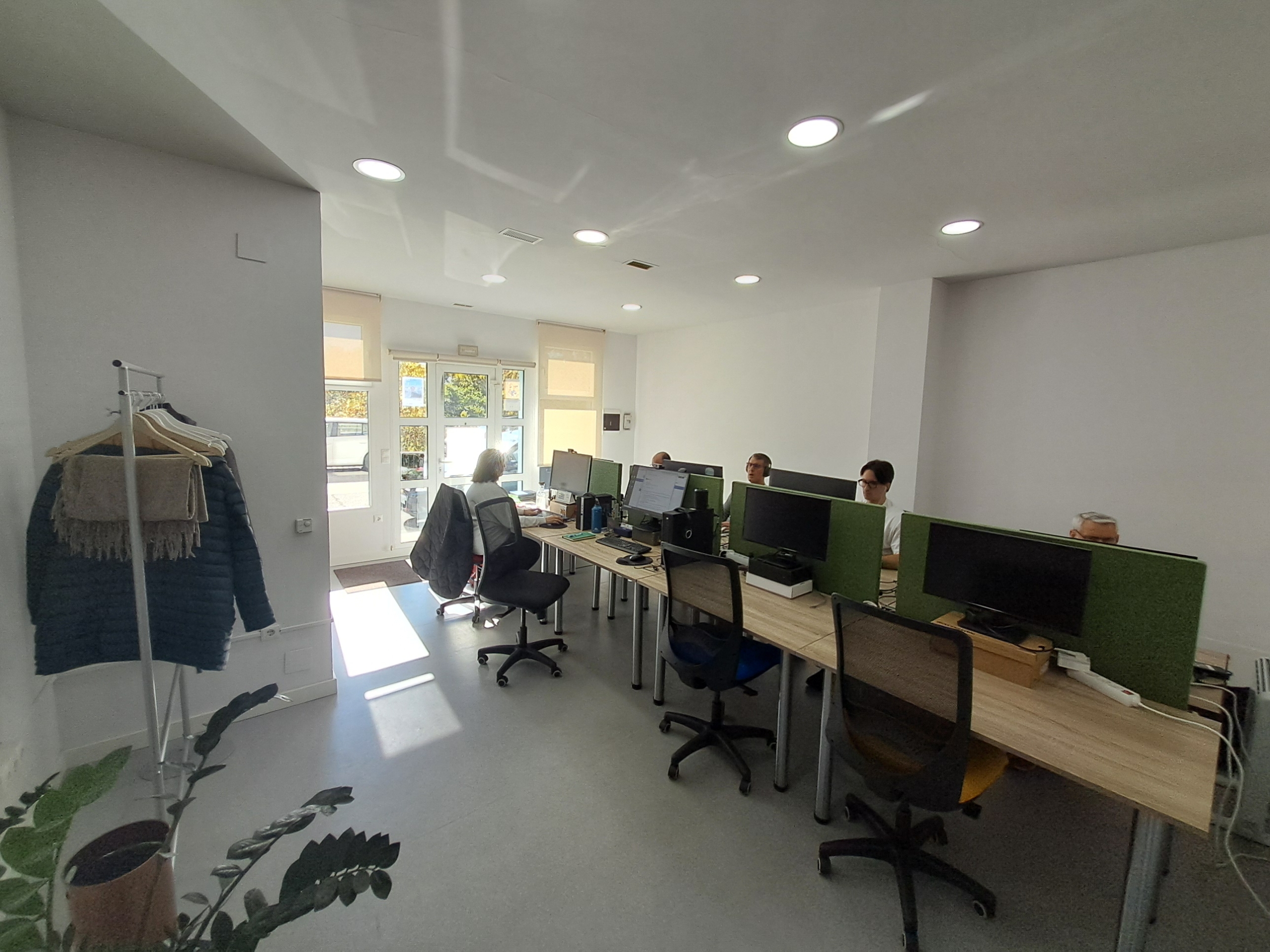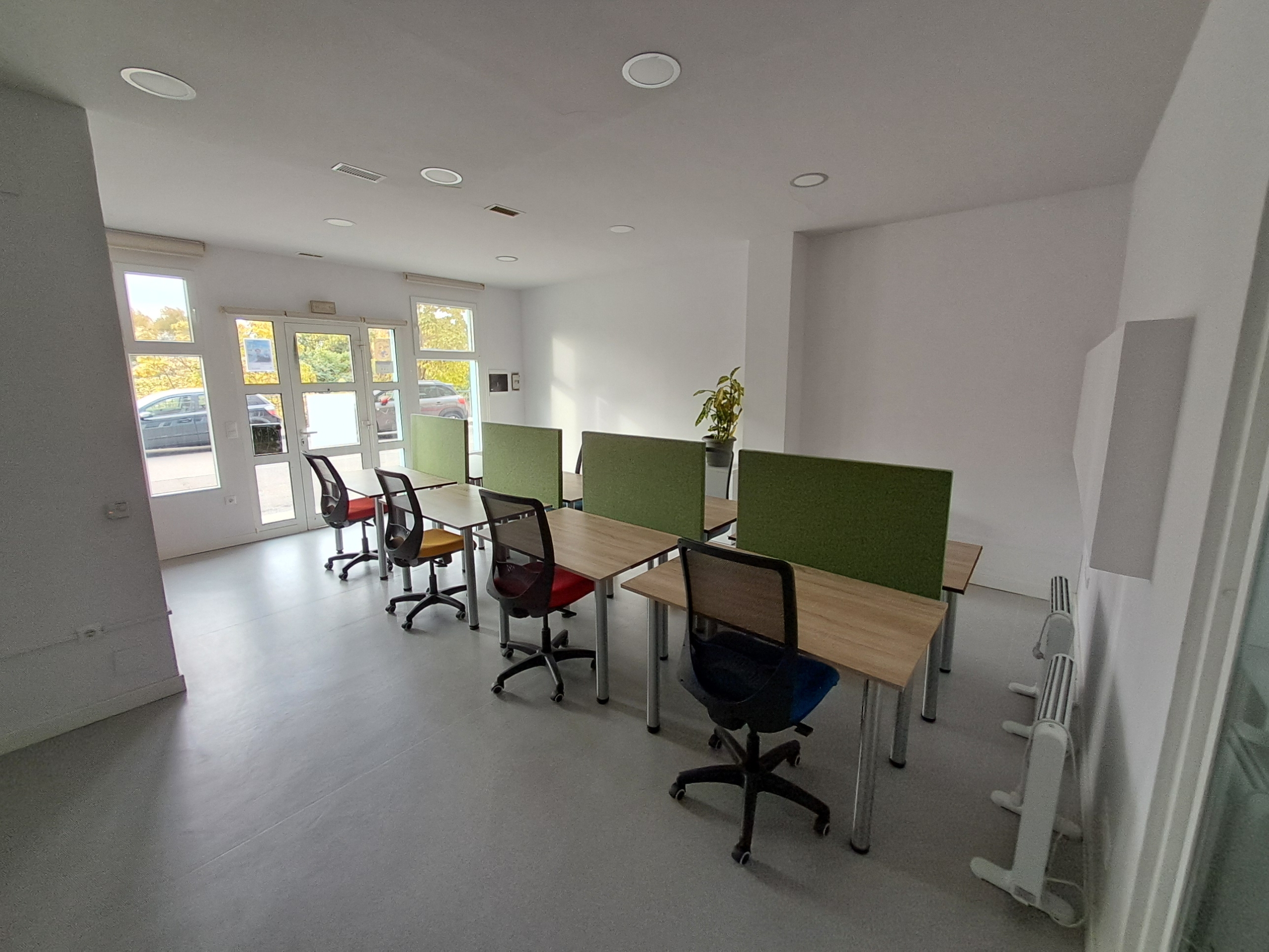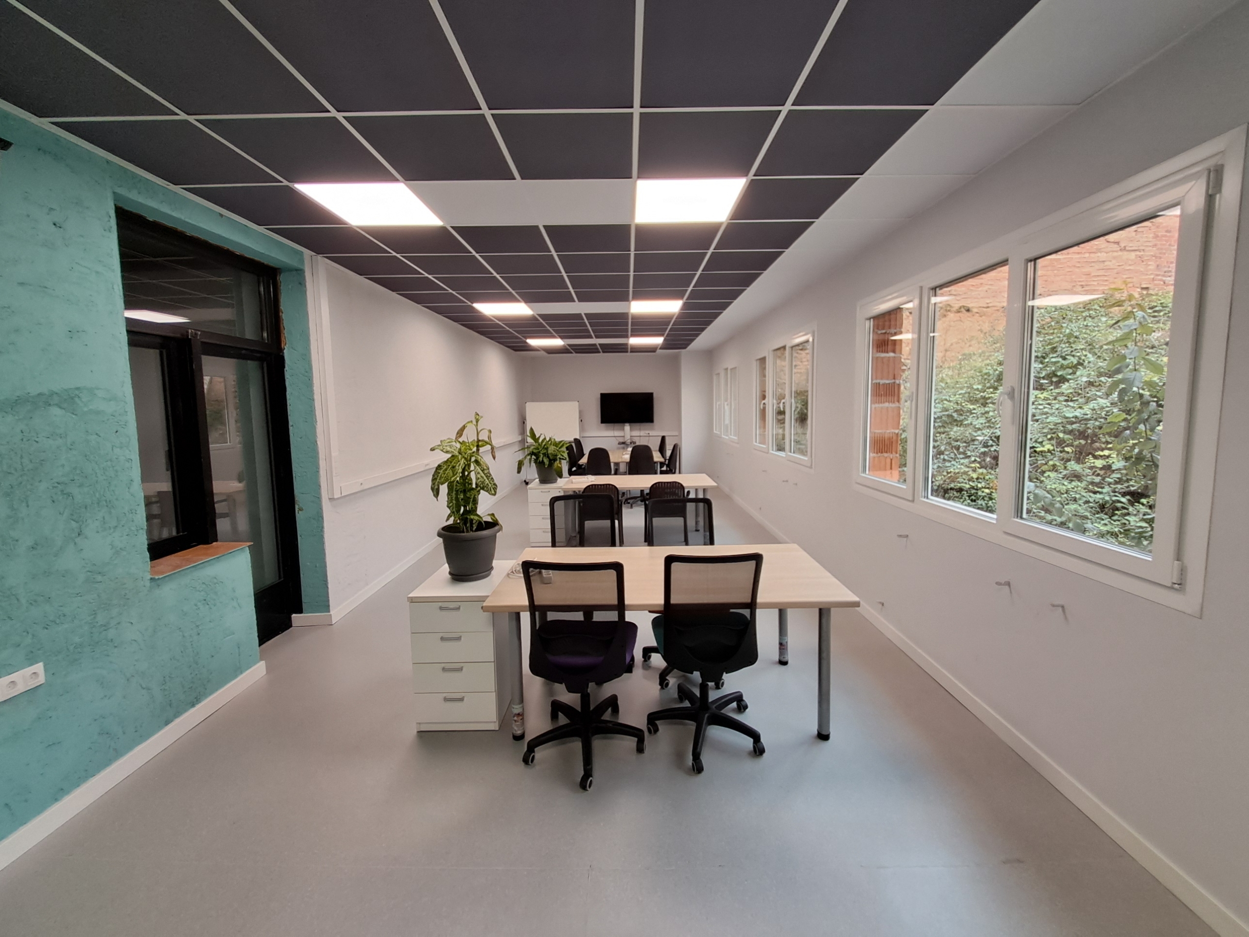 8 puestos de trabajo con mesas y sillas de escritorio, monitores, taquillas, internet de alta velocidad (1Gb) por cable y wifi, mucha luz natural y calefacción y refigeración por aerotermia radiante/refrescante.Además, recientemente hemos añadido separadores acústicos entre mesas consiguiendo una calidad acústica óptima para el uso de oficina compartida (nivel bajo de eco y reverberación), así como unas condiciones idóneas para la privacidad y concentración.