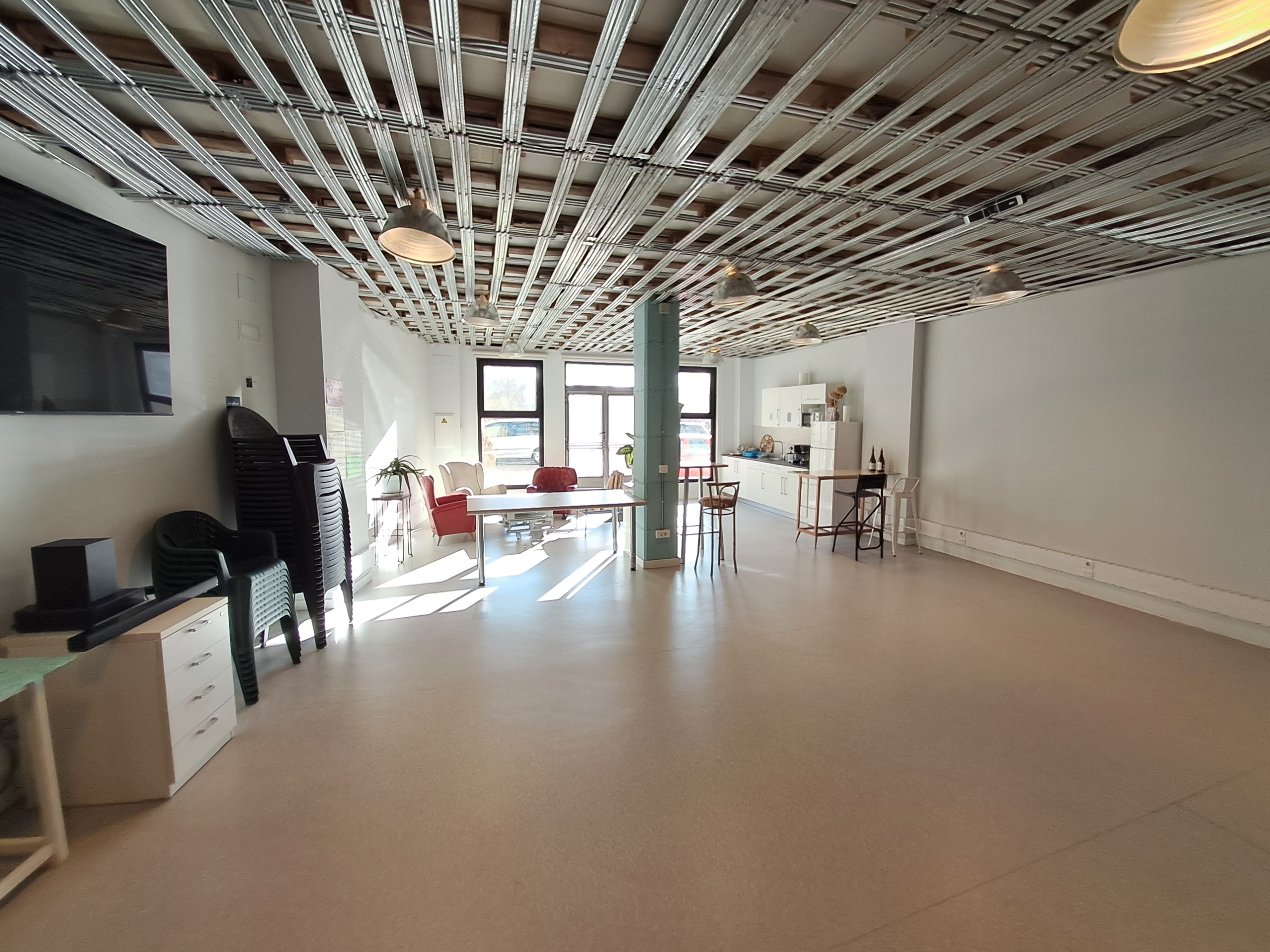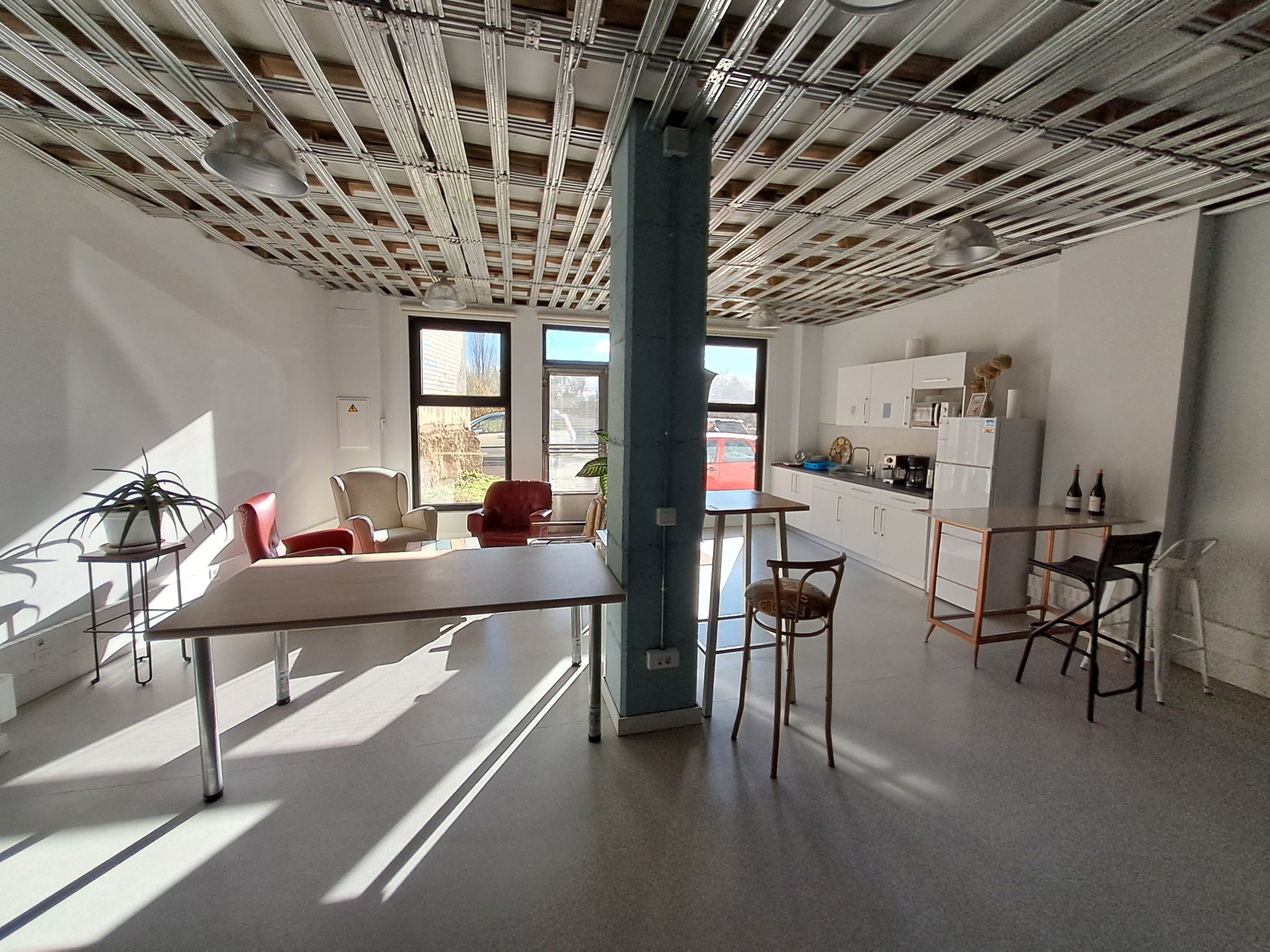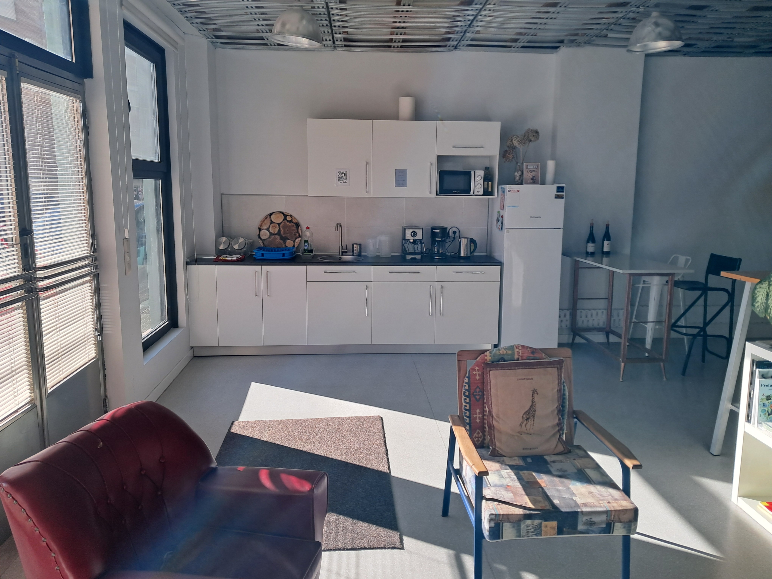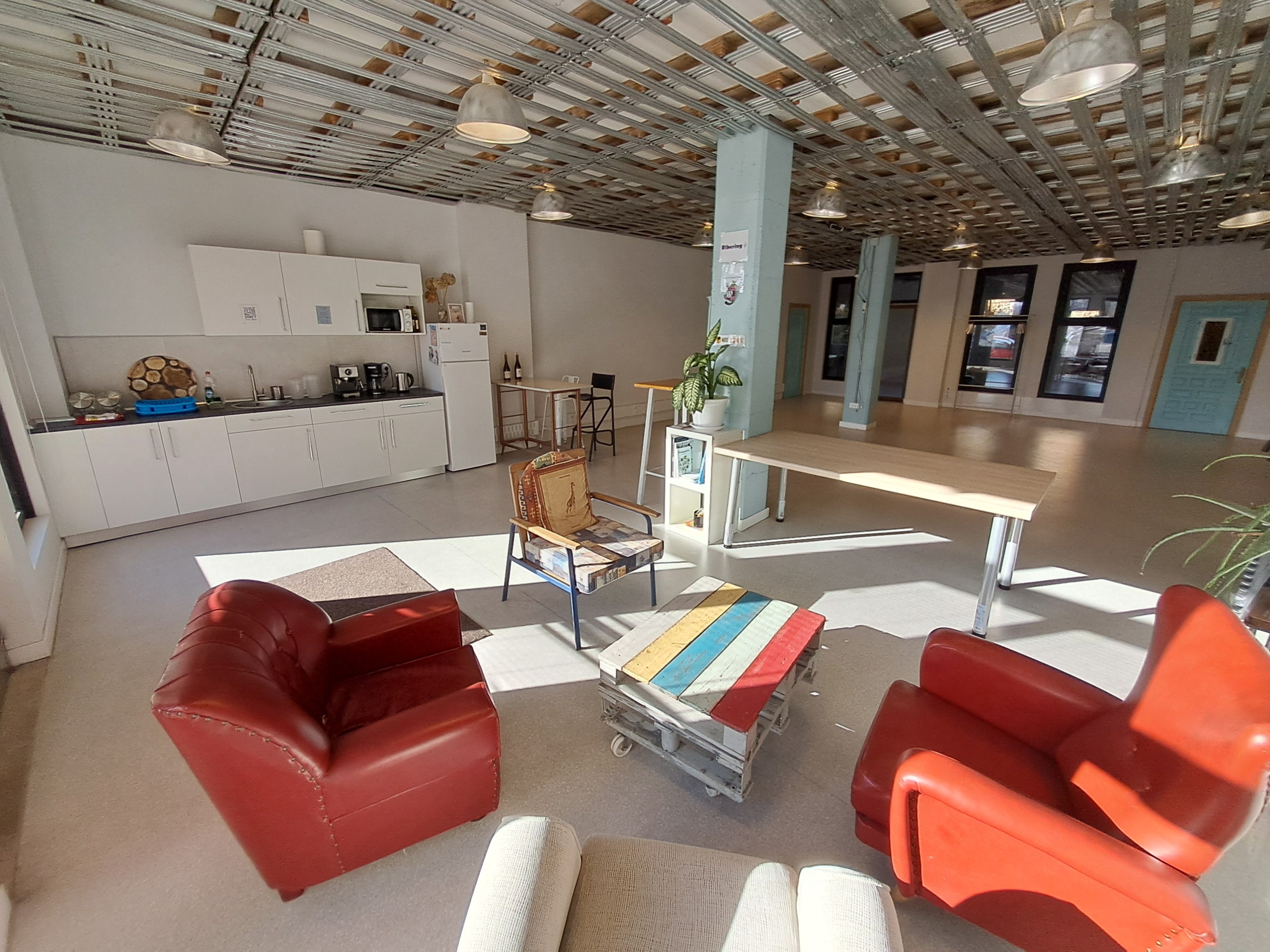 Espacio polivalente donde se concentran todas las actividades de socialización, colindando con el espacio de eventos. Cuenta con:Cocina completamente equipada: frigo, microondas, cafetera, vitro, máquinas de té y café, utensilios, cubertería, etc.Comedor con amplia mesa baja y 2 mesas altas, que hacen también las funciones de catering en los eventos.Sala de estar para la convivencia y relajación, con cómodos sofás, mesita con ruedas y pequeña librería. Ideal para tomarse un café/té, charlar con otros coworkers, mantener una reunión informal, relajarse leyendo o echarse una mini siesta, etc.